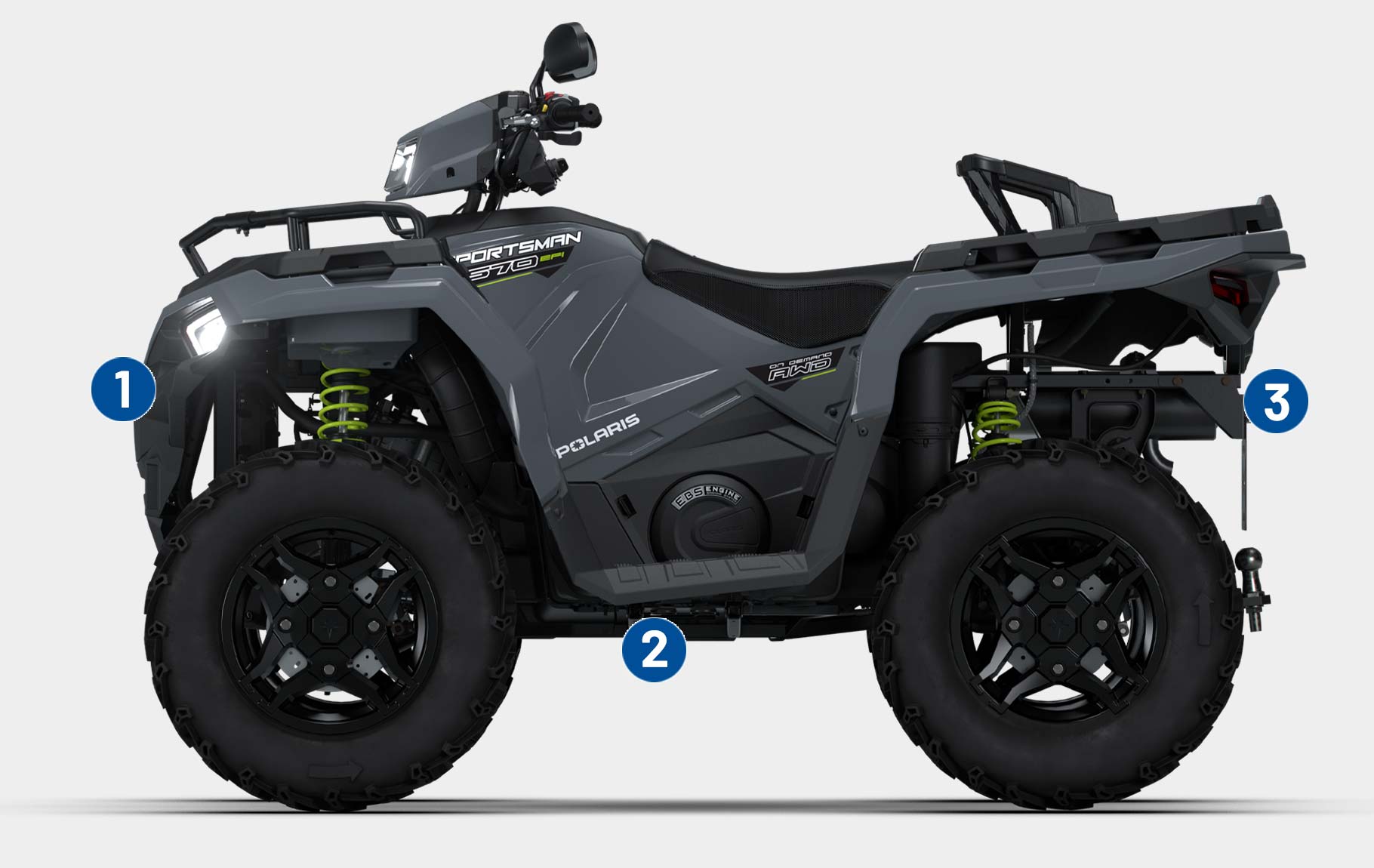 Prise 12 volts, port de charge lente intégré, système de sécurité activé par code PIN, Rallonge de porte-bagages avant, support de treuil inclus, protections CV